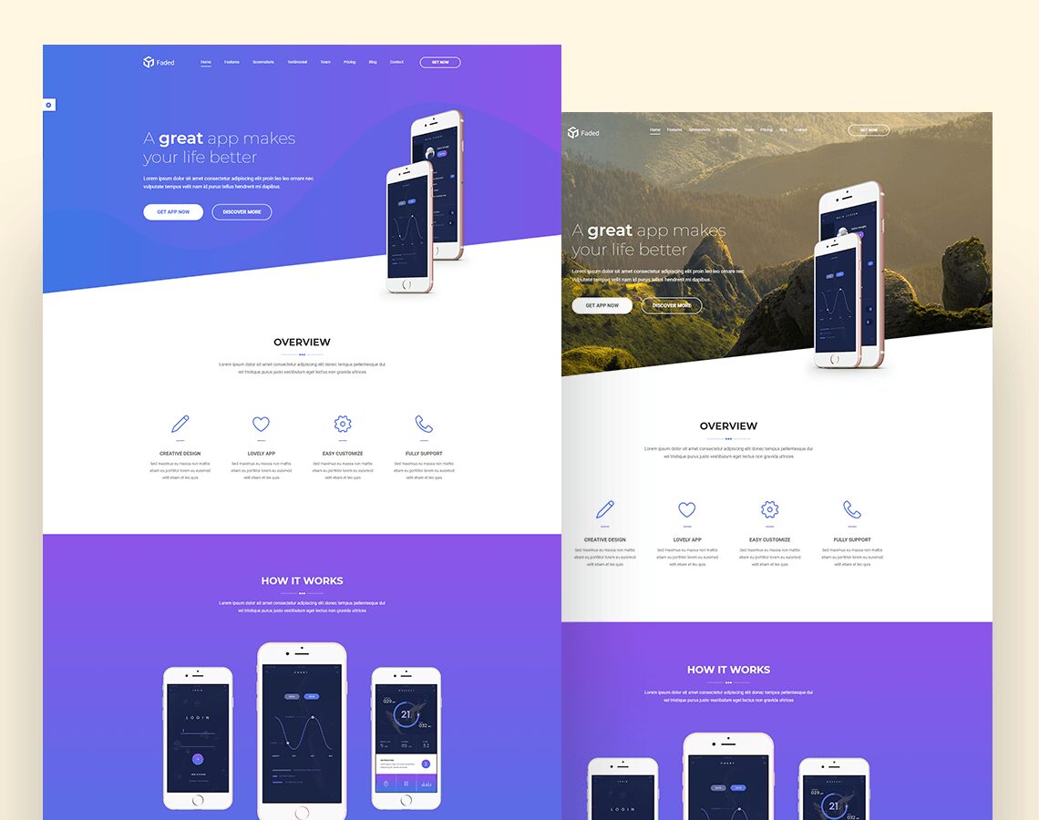 Sing Page and Multi Page Faded facilitates single page and multi page variations that give you real flexibility to create your next app landing page website exactly the way you want.
